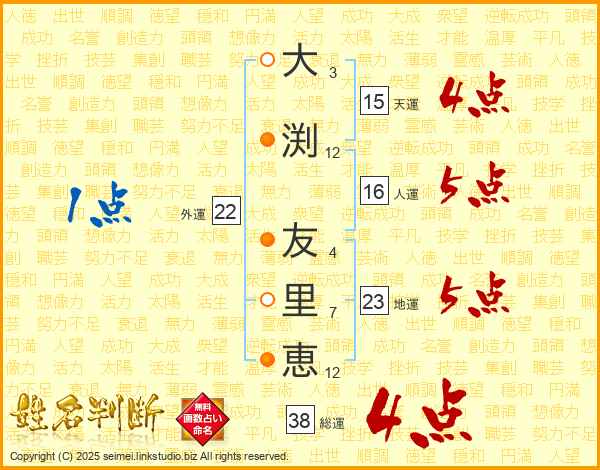 大(3画)渕(12画) 友(4画)里(7画)恵(12画)