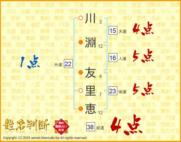 川(3画)淵(12画) 友(4画)里(7画)恵(12画)