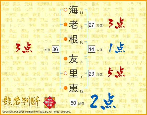 海(11画)老(6画)根(10画) 友(4画)里(7画)恵(12画)