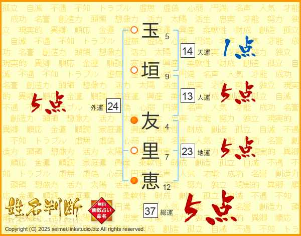 玉(5画)垣(9画) 友(4画)里(7画)恵(12画)