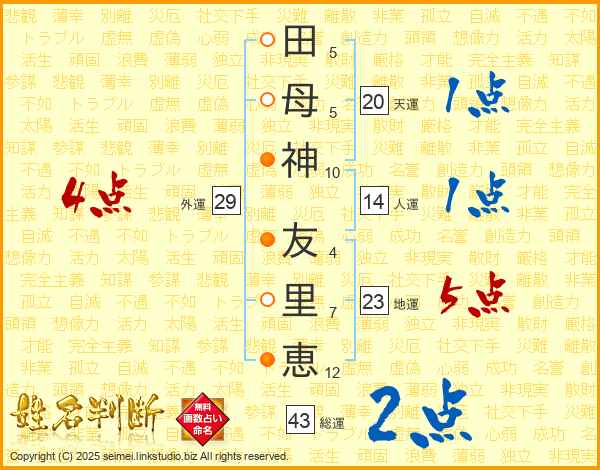田(5画)母(5画)神(10画) 友(4画)里(7画)恵(12画)