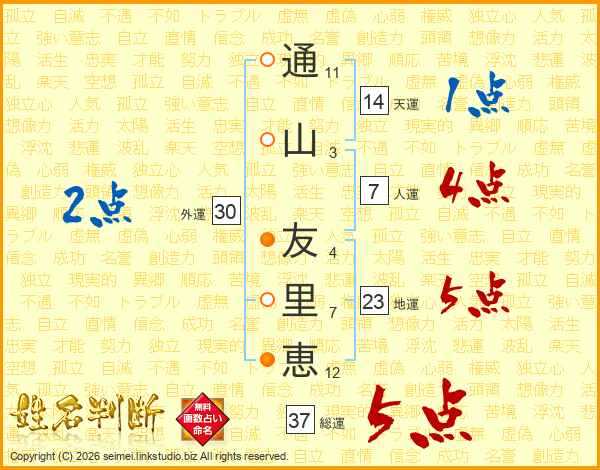 通(11画)山(3画) 友(4画)里(7画)恵(12画)
