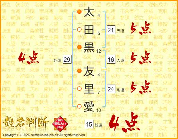 太(4画)田(5画)黒(12画) 友(4画)里(7画)愛(13画)