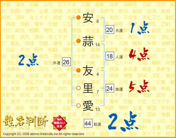 安蒜友里愛さんの総運は44画の2点!