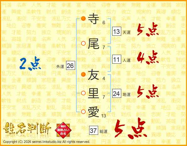 寺尾友里愛さんの総運は37画の5点!