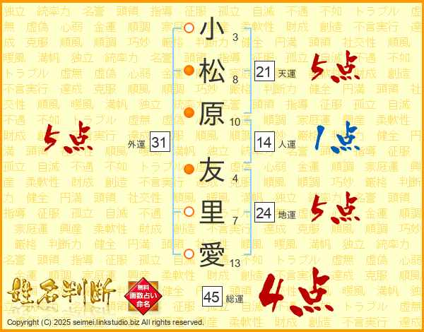 小松原友里愛さんの総運は45画の4点!