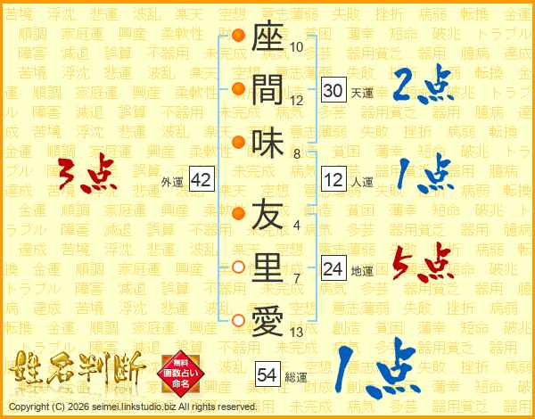 座(10画)間(12画)味(8画) 友(4画)里(7画)愛(13画)
