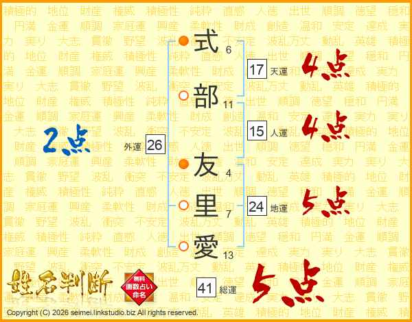 式部友里愛さんの総運は41画の5点!