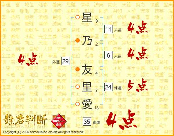 星(9画)乃(2画) 友(4画)里(7画)愛(13画)