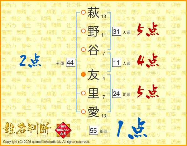 萩(13画)野(11画)谷(7画) 友(4画)里(7画)愛(13画)