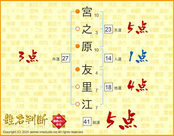 宮(10画)之(3画)原(10画) 友(4画)里(7画)江(7画)