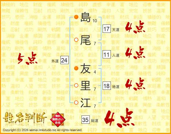 島(10画)尾(7画) 友(4画)里(7画)江(7画)
