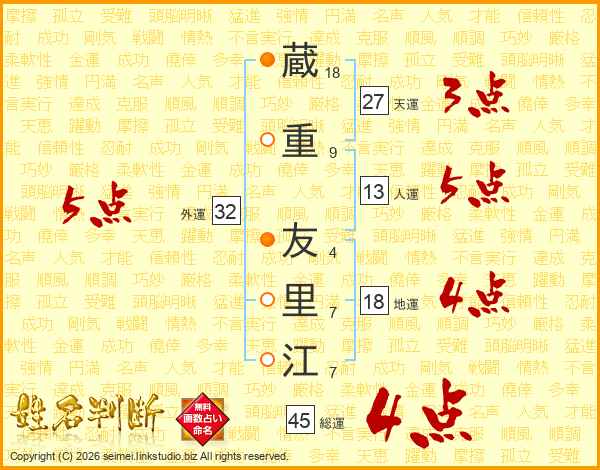 蔵(18画)重(9画) 友(4画)里(7画)江(7画)