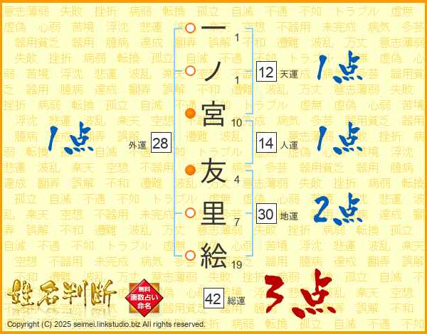 一(1画)ノ(1画)宮(10画) 友(4画)里(7画)絵(19画)