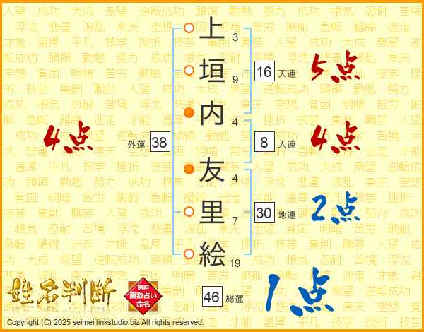 上(3画)垣(9画)内(4画) 友(4画)里(7画)絵(19画)