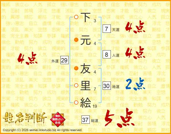 下元友里絵さんの総運は37画の5点!