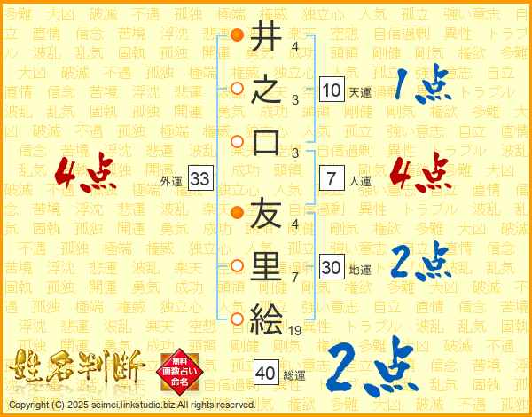 井(4画)之(3画)口(3画) 友(4画)里(7画)絵(19画)