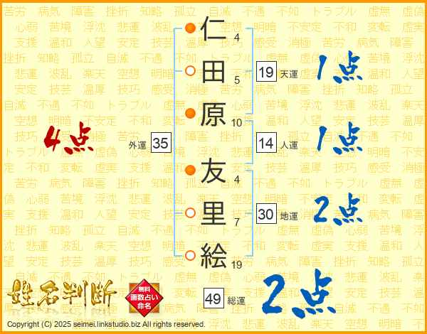 仁(4画)田(5画)原(10画) 友(4画)里(7画)絵(19画)