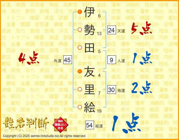 伊(6画)勢(13画)田(5画) 友(4画)里(7画)絵(19画)