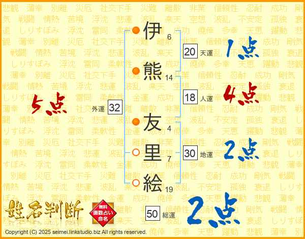 伊(6画)熊(14画) 友(4画)里(7画)絵(19画)