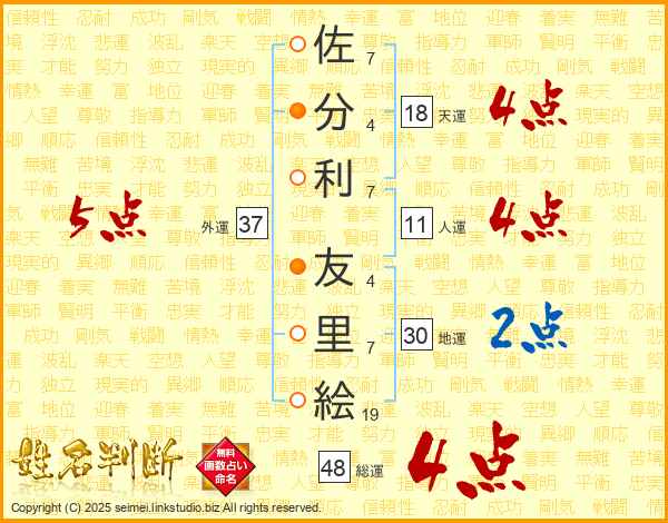 佐(7画)分(4画)利(7画) 友(4画)里(7画)絵(19画)