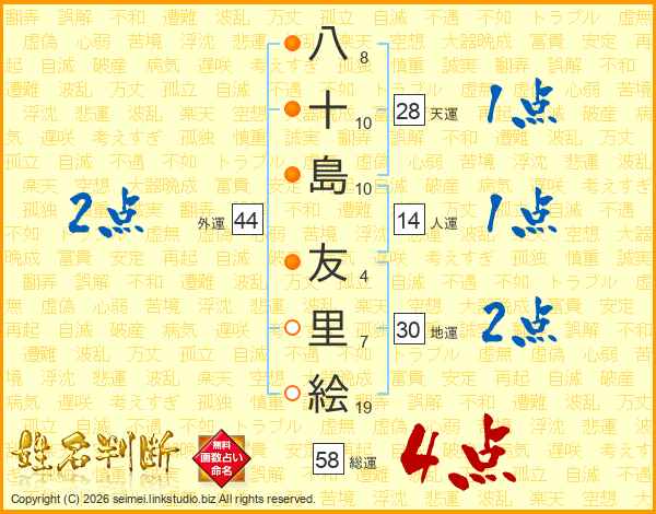 八(8画)十(10画)島(10画) 友(4画)里(7画)絵(19画)