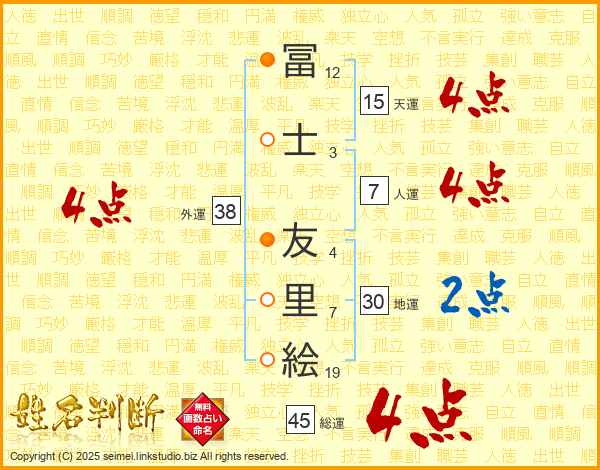 冨(12画)士(3画) 友(4画)里(7画)絵(19画)