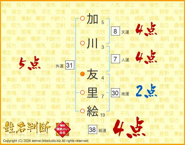 加(5画)川(3画) 友(4画)里(7画)絵(19画)