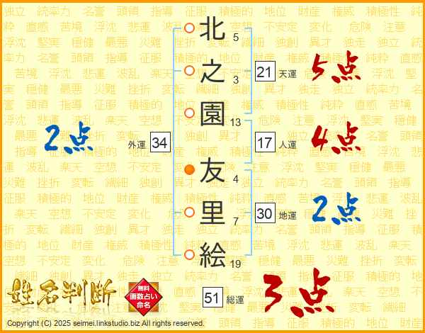 北(5画)之(3画)園(13画) 友(4画)里(7画)絵(19画)