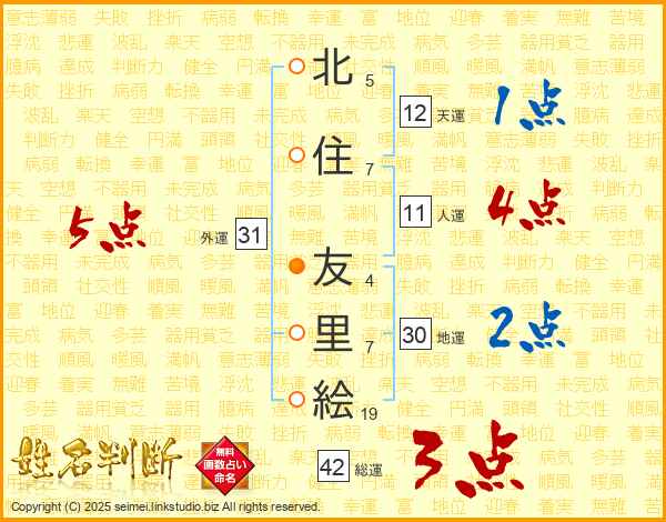北(5画)住(7画) 友(4画)里(7画)絵(19画)
