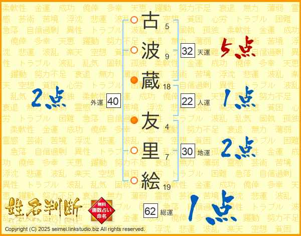 古(5画)波(9画)蔵(18画) 友(4画)里(7画)絵(19画)