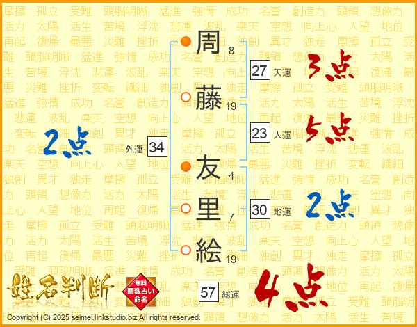 周藤友里絵さんの総運は57画の4点!