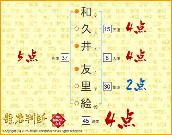 和(8画)久(3画)井(4画) 友(4画)里(7画)絵(19画)