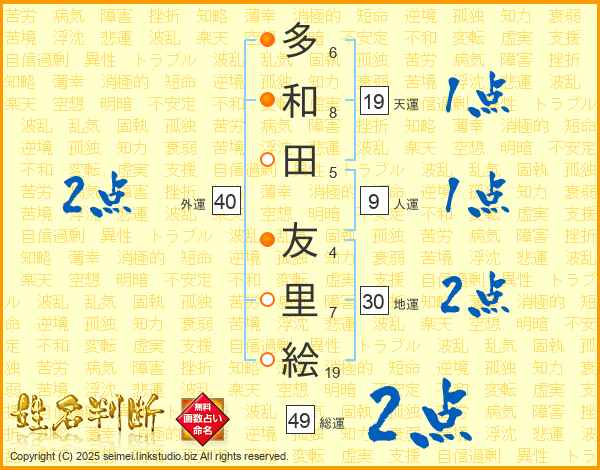 多(6画)和(8画)田(5画) 友(4画)里(7画)絵(19画)