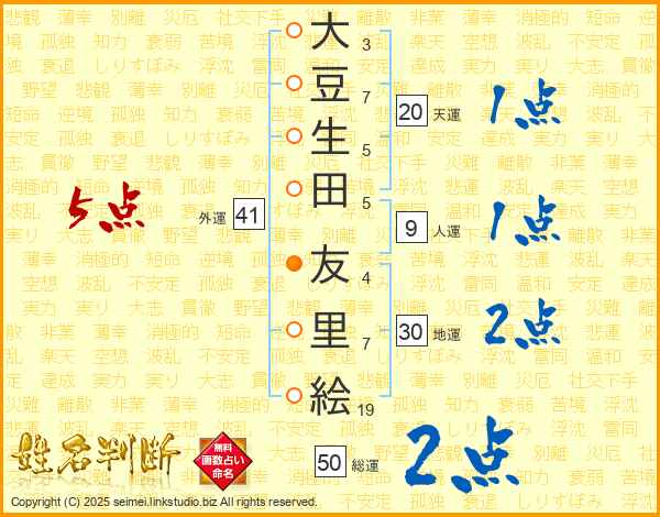 大(3画)豆(7画)生(5画)田(5画) 友(4画)里(7画)絵(19画)