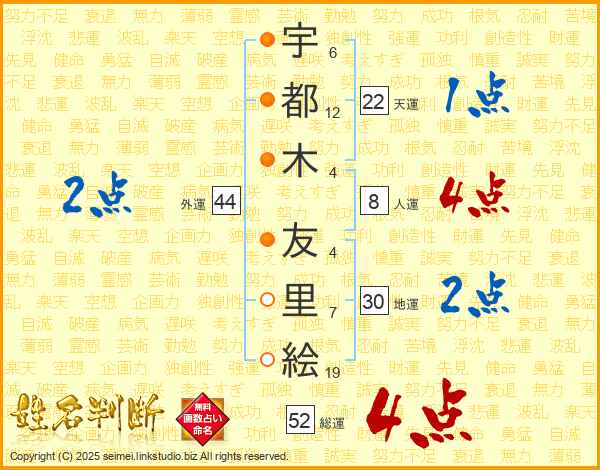 宇(6画)都(12画)木(4画) 友(4画)里(7画)絵(19画)
