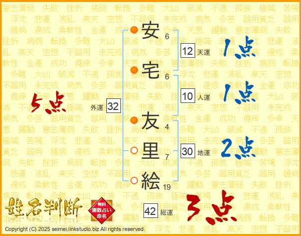 安(6画)宅(6画) 友(4画)里(7画)絵(19画)
