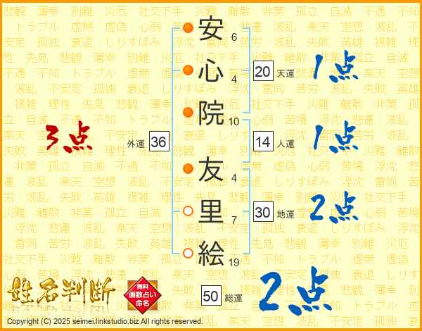 安(6画)心(4画)院(10画) 友(4画)里(7画)絵(19画)