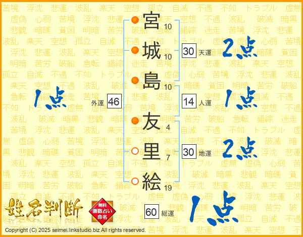 宮(10画)城(10画)島(10画) 友(4画)里(7画)絵(19画)
