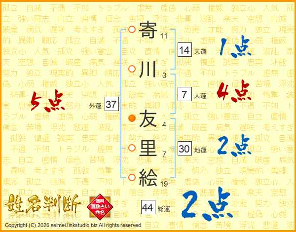 寄(11画)川(3画) 友(4画)里(7画)絵(19画)
