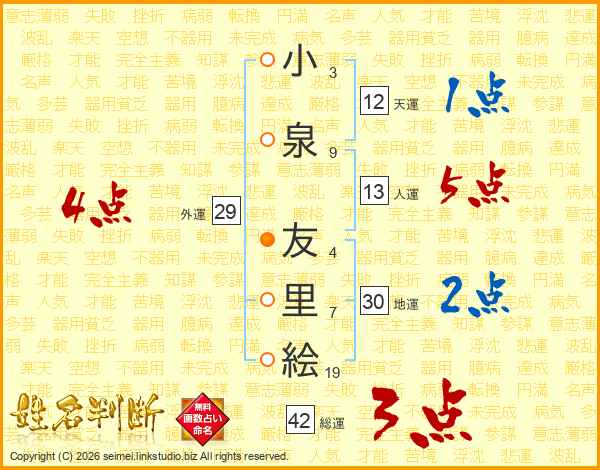 小(3画)泉(9画) 友(4画)里(7画)絵(19画)