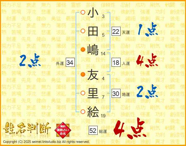 小(3画)田(5画)嶋(14画) 友(4画)里(7画)絵(19画)