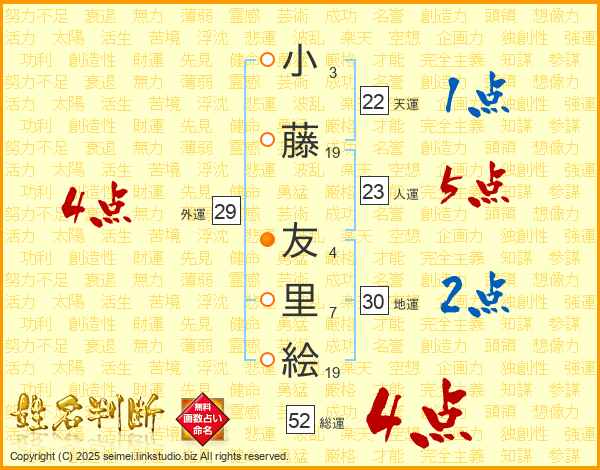小(3画)藤(19画) 友(4画)里(7画)絵(19画)