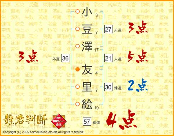 小(3画)豆(7画)澤(17画) 友(4画)里(7画)絵(19画)