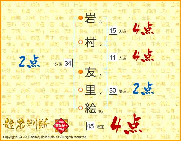 岩村友里絵さんの総運は45画の4点!