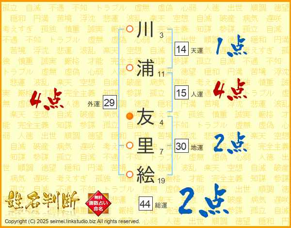 川(3画)浦(11画) 友(4画)里(7画)絵(19画)