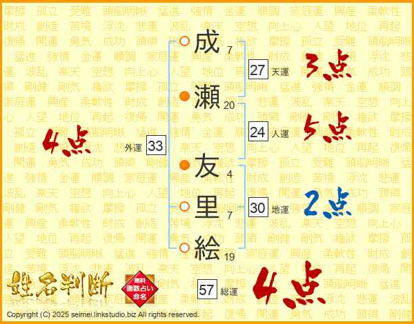 成(7画)瀬(20画) 友(4画)里(7画)絵(19画)