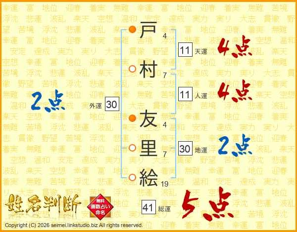 戸(4画)村(7画) 友(4画)里(7画)絵(19画)