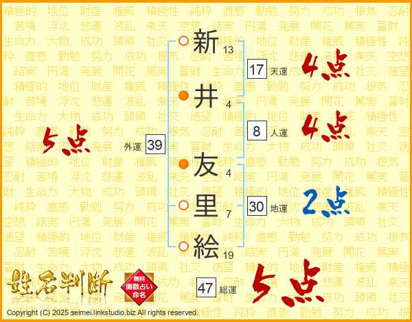 新(13画)井(4画) 友(4画)里(7画)絵(19画)
