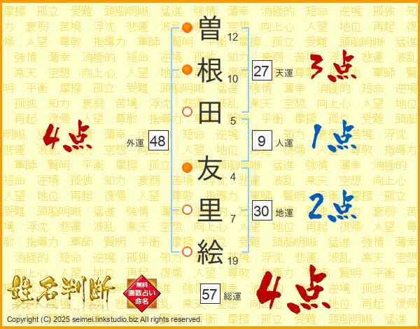 曽(12画)根(10画)田(5画) 友(4画)里(7画)絵(19画)